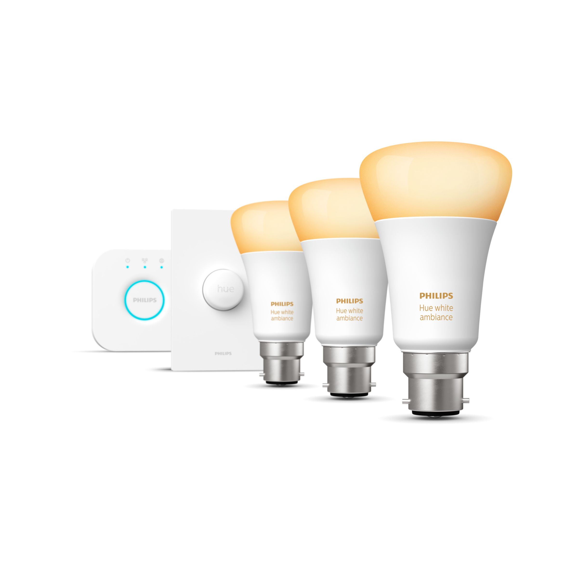 Enjoy relaxing and energizing scenes or create your own routines right out of the box with the Hue White ambiance B22 starter kit. Includes Hue Bridge, 3 smart bulbs that offer the full spectrum of white light and a Smart Button.