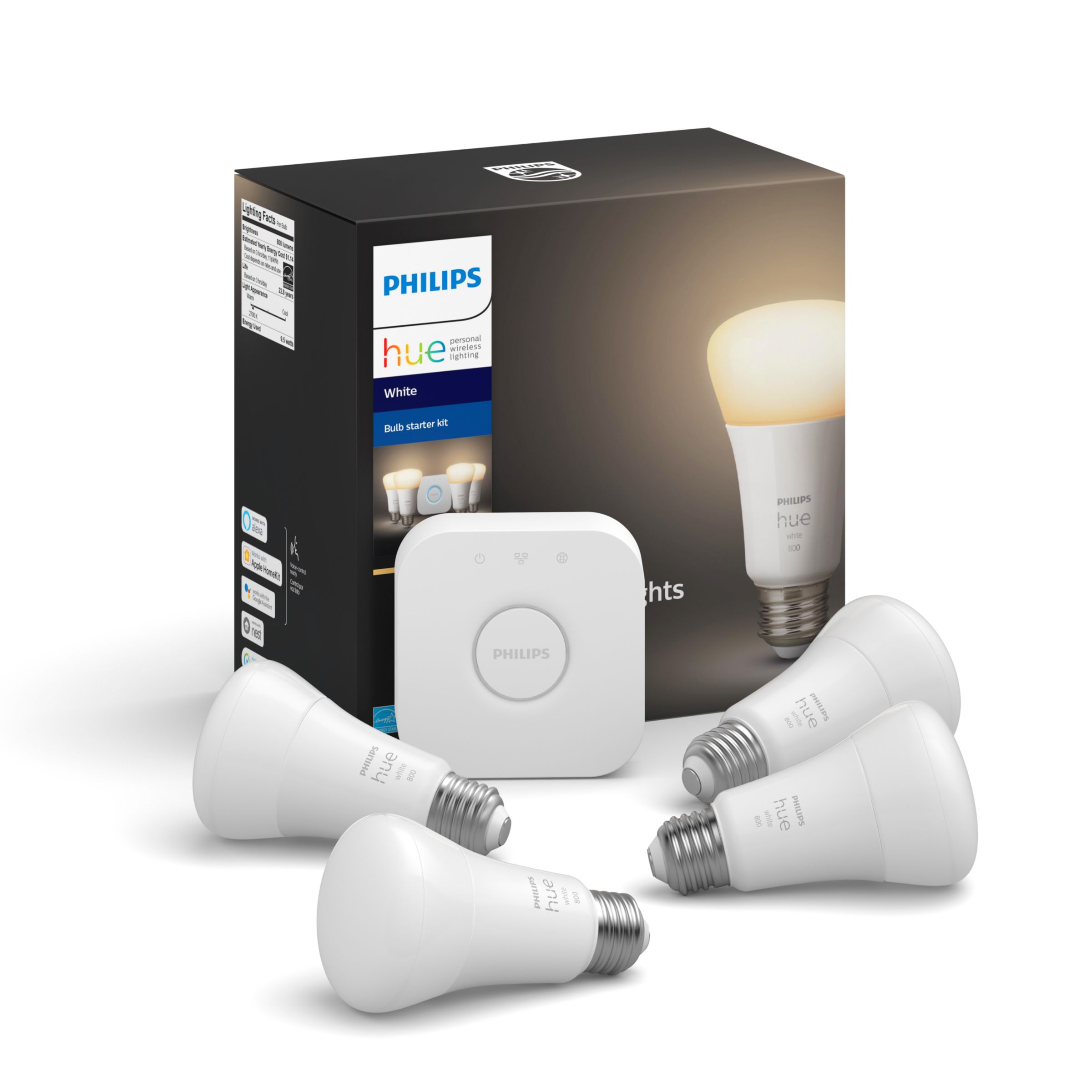 Get your smart lighting system started with this Starter kit, which includes four smart bulbs with soft white light and the Hue Bridge. It's a complete kit for custom control over your home lighting and all its great features. As bright as a 60 W bulb.