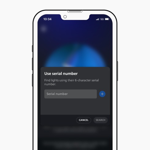 - Select Use serial number, enter the six-digit code, tap the blue plus (+) button, and tap Search. Note that the serial number consists of six characters: a number between 0 and 9 or a letter between A and F.